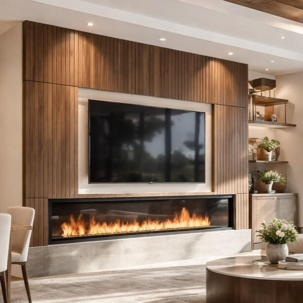 Tech-Integrated Entertainment. Floor-to-ceiling designs featuring hidden wire management, precision TV mounting, and smart LED atmospheric lighting. Perfect for open-concept great rooms.• Electric fireplaces