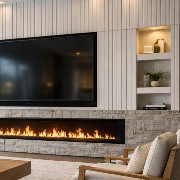 Tech-Integrated Entertainment. Floor-to-ceiling designs featuring hidden wire management, precision TV mounting, and smart LED atmospheric lighting. Perfect for open-concept great rooms.• Electric fireplaces